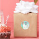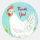 A thank you sticker decorated with a white chicken in a patch of dandelions drawn with pencil with a robins egg blue watercolor background.