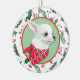 On the front of this Holiday ornament is a watercolor portrait of an adorable white Chihuahua dog wearing a red Christmas scarf. The portrait is placed within a pretty green holly leaf and red berry pattern circular frame. The back of the ornament has the same background and circle with your custom text in matching red and green.