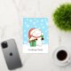 Smiling white cat in a traditional red Christmas hat holding a large wrapped present is wishing everyone a very merry Christmas! In its left paw the cat is holding high a golden bell with a green bow. Cute and original Christmas party invitation!