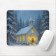 A charming church, nestled in a snowy forest landscape, glows warmly from its illuminated windows, creating a beautiful contrast with the cool, tranquil surroundings