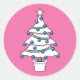An illustration of an elegant chic white Christmas tree with plenty of blue hanging balls in pink background. This design is for people who loves Christmas, giving gifts and giveaways.