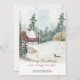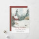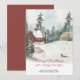 Traditional white christmas holiday card with peaceful watercolor winter landscape of a lakeside cabin, pine trees and a snow field with a sledge and a duck on the lake. The wording reads "Merry Christmas and a Happy New Year" in neat handwritten typography and the template is set up for your personalised text.