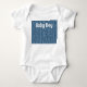 This baby bodysuit has an art deco design that looks like likes on a circuit board. The lines are running vertically in white on a field of blue. Want a different colour? Message me.