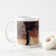 Chess-themed ceramic coffee mug featuring fall colours with oversized black king and white pawn chess pieces on a wooden deck. Ideal for chess lovers, gift ideas, or cosy autumn vibes. Picture taken at the NC Botanical Gardens, Chapel Hill.