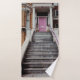 WHITE CONCRETE HOUSE SHOWING CLOSED PURPLE WOODEN BATH TOWEL