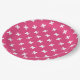 White cross stitches on fuchsia paper plate