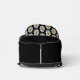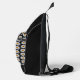 This black crossbody sling bag with zippered pocket goes where you go when biking and hiking and features on the front, zippered pocket the image of a white Dahia flower printed in a repeating pattern on a solid, black background. A fun, floral design!