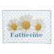 Three white daisies with a template for custom name in blue on white background with blue polka dots.