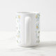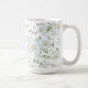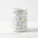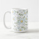 A floral print mug with a pretty pattern of white daisies and blossoms with the green leaves celebrating the beauty of nature.