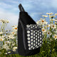 This black crossbody sling bag with zippered pocket goes where you go when biking and hiking and features on the front, zippered pocket the image of a white Daisy flower printed in a repeating pattern on a solid, black background. A fun, floral design!