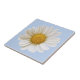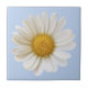 A close-up photo of a beautiful white daisy flower with yellow centre on light blue background.
