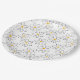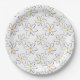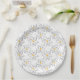 Paper plates printed with white daisy pattern on white background, from original watercolor painting.