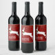 Festive holiday full size wine labels, done in red, with graphics of gold stars and the silhouette of a white deer. Personalise the white text, on the bottom of the label, for your holiday gift giving or Christmas party.