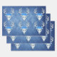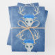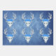This set of wrapping paper sheets are a mix of misty blues and whites with rows of white deer heads with large white antlers and three big blue roses on their heads.