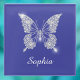 A classy white diamond butterfly with white script name on deep blue background.