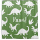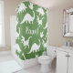 White dinosaur, bones, and dino tracks silhouettes patterned shower curtain with the word "Rawr!" in the centre!
