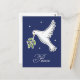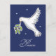 Holiday postcard featuring an illustration of a beautiful, white dove holding an olive branch. Dark blue background with white stars and the text "Peace" below the dove.
