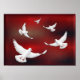 A DRAWING OF WHITE DOVES IN FLIGHT AGAINST ARED SKY