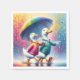 Two white ducks wearing colourful raincoats and matching boots walk under a rainbow umbrella in a vibrant rainy setting