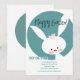 A cute Easter invitation featuring a white bunny and the words "Happy Easter" against a blue and white background. (DLCA.NET)