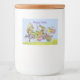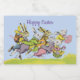 This custom label for a food jar has a group of white Easter rabbits dressed in pastel coloured clothing running in grass under a blue sky carrying coloured eggs and baskets. Customise the Happy Easter text with the template.