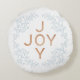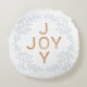 Beautiful and elegant round pillow design featuring "JOY" written in big bold letters on a white background with dusty blue botanical elements.