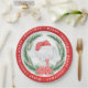 This cute White Elephant paper plate design features a watercolor elephant peeking out from a Christmas wreath. The words "Merry Christmas" are written in white all around the outer edge on a red background.