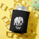 A can cooler in black with white elephant.