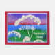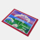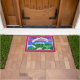 Minimalist custom doormat in greens and blues with stylised elm trees in the foreground.