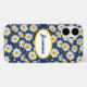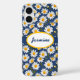 Cute, little, white daisies with bright yellow centres on a blue background creates a simple and sweet iPhone case. Personalise with your name in a yellow-bordered oval held by a dark blue band.
