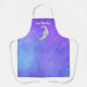 This kitchen apron has a white crescent moon with a face with fancy abstract designs in colours of blue, yellow, and purple on a celestial sky background of mixed purples and blues with dotted stars. Customise your text with the template.