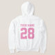 White fleece hoodie for women with jersey number. Modern typography design. Custom athletic clothing for sports fans. Double sided print with pink text. Available in grey, white, black and other colours. Great for fans of football, baseball, basketball, volleyball etc.