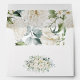 delicate floral arrangement with soft white and cream-coloured roses, hydrangeas, and lush greenery, accented by subtle golden highlights. The flowers and foliage are painted in a watercolor style, creating an elegant and timeless aesthetic.