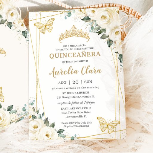 Elegant Ivory White Floral Gold QuinceañeraDesigned by The Happy Cat Studio