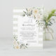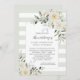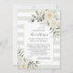 The wedding invitation showcases a romantic and elegant design. It features a lush floral arrangement with white and cream-coloured flowers, such as roses and peonies, interspersed with green foliage and white berries. The background alternates light green and white horizontal stripes, adding a subtle and stylish texture. The central text is framed within a white rectangular box, bordered by the floral accents, creating a balanced and sophisticated aesthetic. The overall look is soft, charming, and perfect for a refined celebration. Easy to personalise with your information.