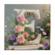This design is special because it features a glossy, cracked white letter E adorned with dew drops and immersed in a lush, sunlit garden setting. It is richly decorated with a vibrant array of soft pink and peach roses, purple flowers, and bright yellow blooms intertwined with green ferns and climbing vines. The composition is whimsical and rustic, making it perfect for a nursery, wedding, or nature-themed decor.