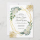 An exquisite invitation with your wedding details inside a gold geometric frame surrounded by delicate white flowers and eucalyptus leaves. A couple of gold confetti sprinkles add the finishing touch to this stunning design. The back of the card reveals a dark green watercolor wash. The perfect invitation for your glamourous spring or summer wedding. You can customise the font or add your own special message. This is part of a wedding suite with matching envelope, menu, place cards and other wedding essentials.