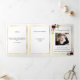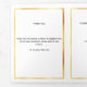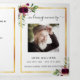 An elegant tri-fold program. A white background, a faux gold frame, burgundy florals and space for your photo. Personalise and add name, dates and your text.