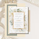 Gorgeous elegant & rustic gold framed wedding invitation with white roses, hydrangeas, freesia with mixed greens of eucalyptus & gold hand drawn leaves were used to create this lovely invite. Just exquisite. Faux gold splashes on front & back to create a chic look.