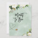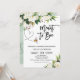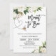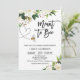 Sweet bee themed bridal shower invitation featuring a bee and heart shaped flight path line, two white and green foliage floral arrangements, and modern calligraphy text heading image. This bee bridal shower invitation has a hint of a boho feel.