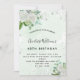 A modern, stylish and glamourous invitation for a woman's 40th (or any age) birthday party. A watercolored green background with faux silver glitter dust and white florals and greenery. The name is written with a modern black hand lettered style script. Personalise and add a name, age and your party details