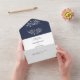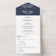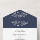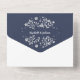 Classy and chic tri-fold white floral on a dark blue background wedding invitation.