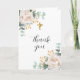 White background. White florals, peonies and eucalyptus greenery. Thank you is written with a large hand lettered style font.