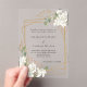 For a classic winter wedding. A clear, transparent background decorated with white flowers and a faux gold geometric frame. Personalise and add your names and details.