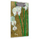 White flowers hang off green stems in this piece by Chariklia Zarris. Set against a tan background and surrounded by a brown border this is a simple but elegant painting. Add it to your home and enjoy the beauty!