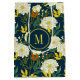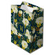 Lush white flowers with colourful leaves seamless pattern over dark-blue background.