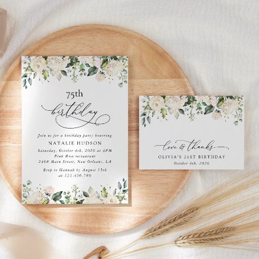 Invite friends and family in style and set the tone for your special day with this charming birthday invitation. Design features white watercolor flowers and greenery on white background.
