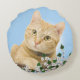 White Flowers & Ginger Tabby Cat on Light Blue Round Cushion