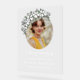 Acrylic transparent in loving memory sign with your loved one's photo inside an oval with pretty white flowers and their name in a modern font. Beautiful transparent acrylic floral funeral sign honouring your loved one and personalised with their name and photo inside an oval shape and adorned with printed white flowers. In loving memory acrylic sign personalised with photo with a white and green floral design for a funeral or memorial service for your daughter, sister, wife, mother, or grandmother.