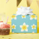 This floral wrapping paper features Destei's pattern of lovely illustrated white and yellow frangipani plumeria flowers on a blue background colour.